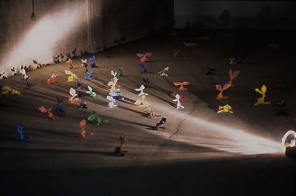 A taxi headlamp and carrier bags in the vaults at Touscene, Stavanger, Norway in the third exhibition called "Killing Time".